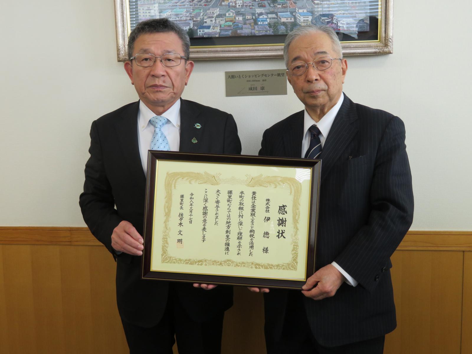2026.03.17 ふるさと納税感謝状贈呈 【まちのできごと・みんなのわだい】 3月17日(火)、令和7年度に藤里町に寄附(企業版ふるさと納税)をいただいた「株式会社伊徳」様に感謝状が贈られました。 今回の寄附金は、地域公共交通事業のために活用させていただきました。 ご寄附ありがとうございました。 ページ上部へ