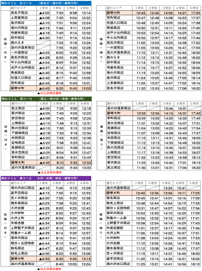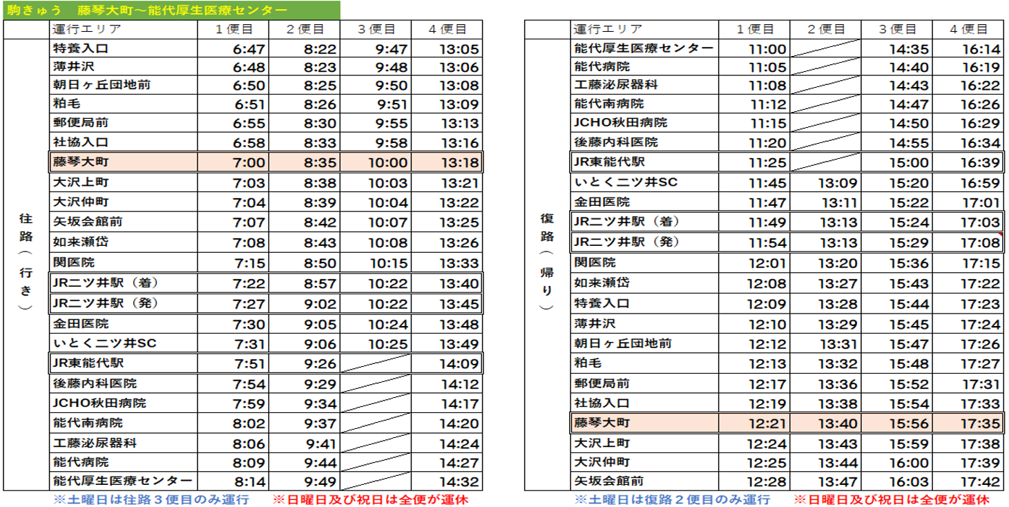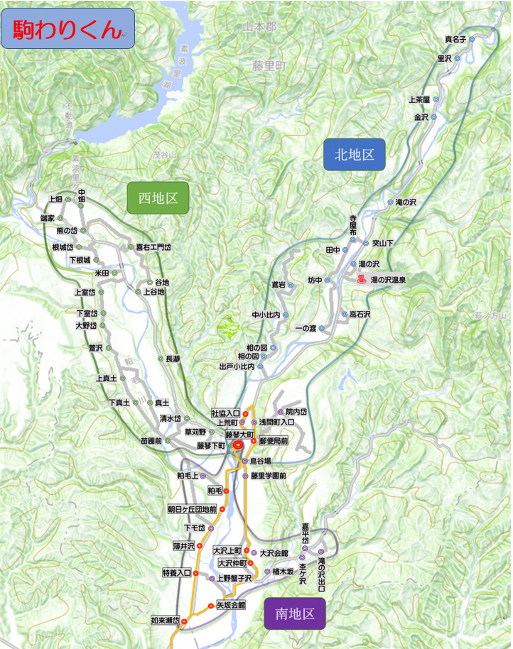 バス路線の廃止や縮小に伴い、令和7年10月1日より、藤里町における主要な公共交通手段がデマンド型乗り合いタクシーとなり、町内の移動は『駒わりくん』、町外(能代市)への移動は『駒きゅう』となります。デマンド型乗り合いタクシーは、町民の他一般の方もご利用できますが、運航時刻の1時間前までのご予約が必要となっております。